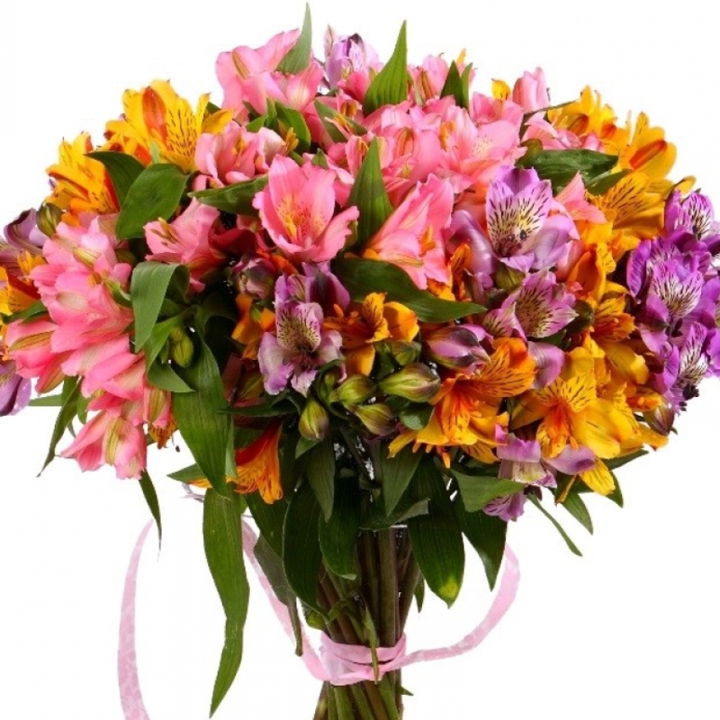Букет состоит из MIX из 21 альстромерии, зелень, прозрачная упаковка, атласная лента.