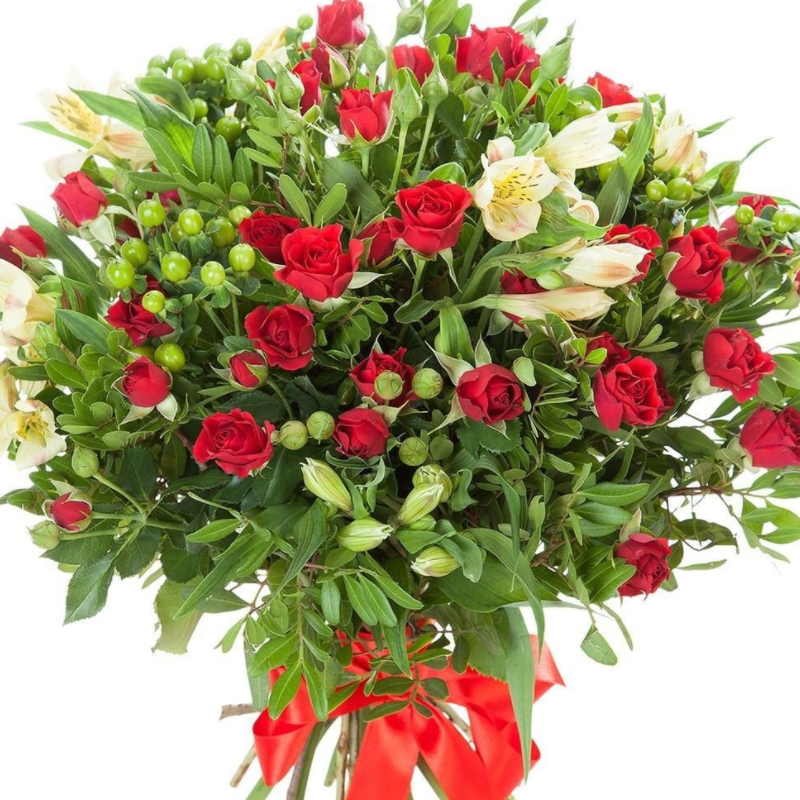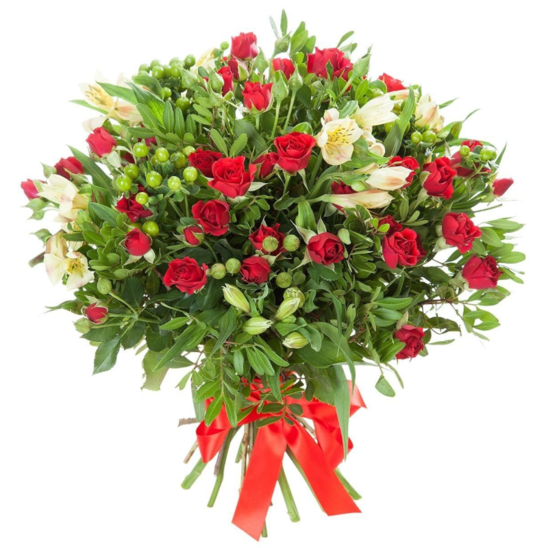 Букет состоит из 9 кустовых роз, 5 альстромерий, 3 ветки гиперикума, зелень, прозрачная упаковка, атласная лента.